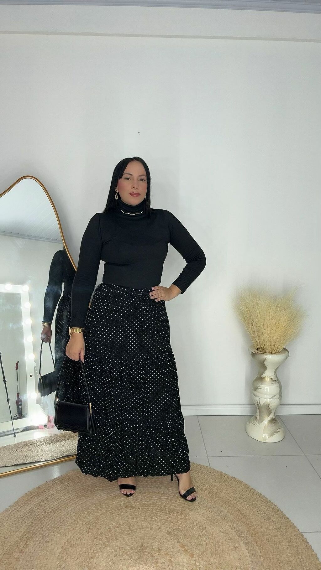 Por que você vai se apaixonar? 🎯 Estampa clássica: Bolinhas que são puro amor e garantem aquele look vintage cheio de personalidade. 🌟 Versatilidade nota 10: Combine com camiseta, blusa de seda ou até um cropped poderoso — o resultado é sempre incrível! 💃 Modelagem que valoriza: Cintura marcada e caimento leve que acompanham seus passos com conforto e elegância.